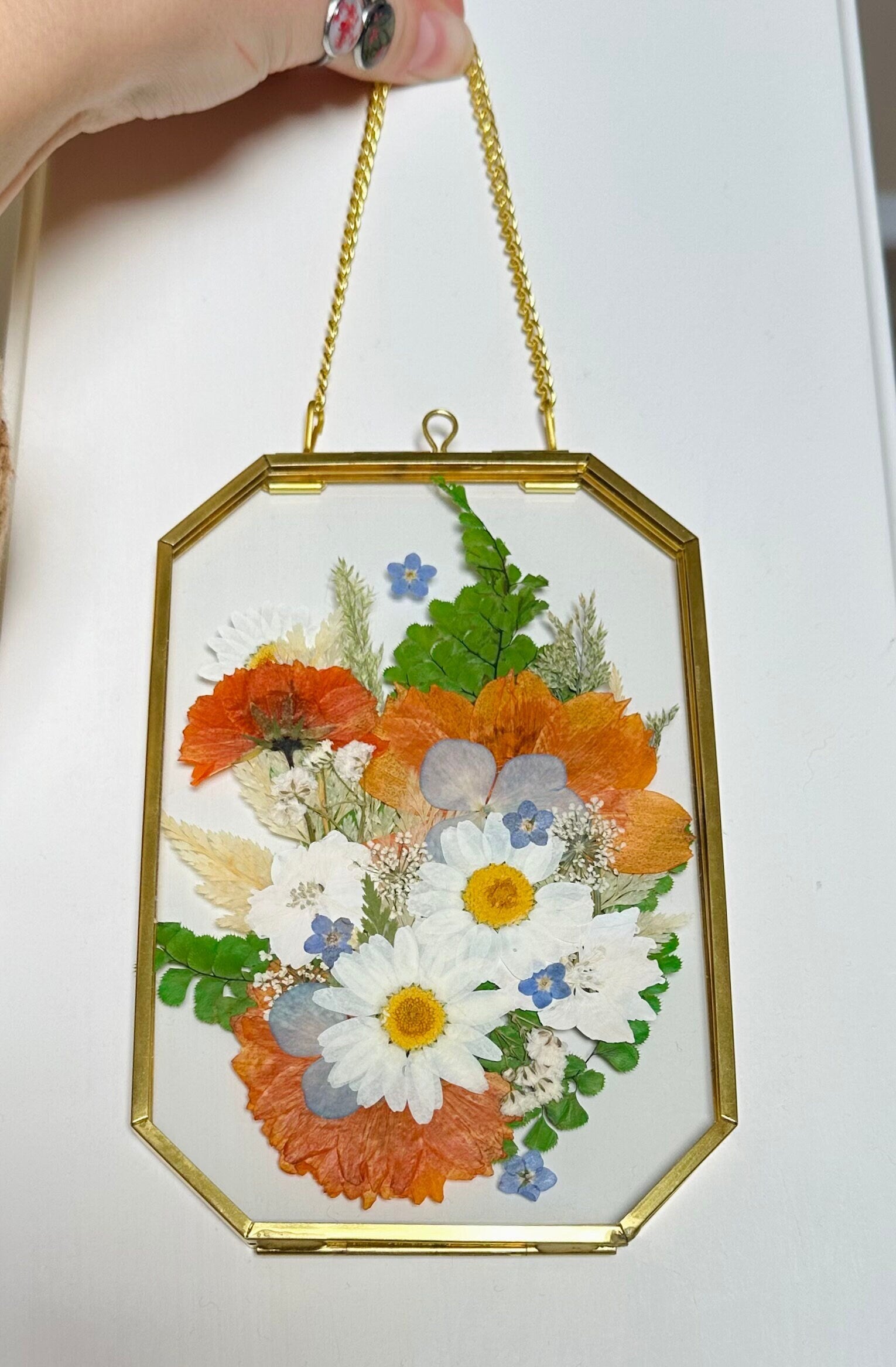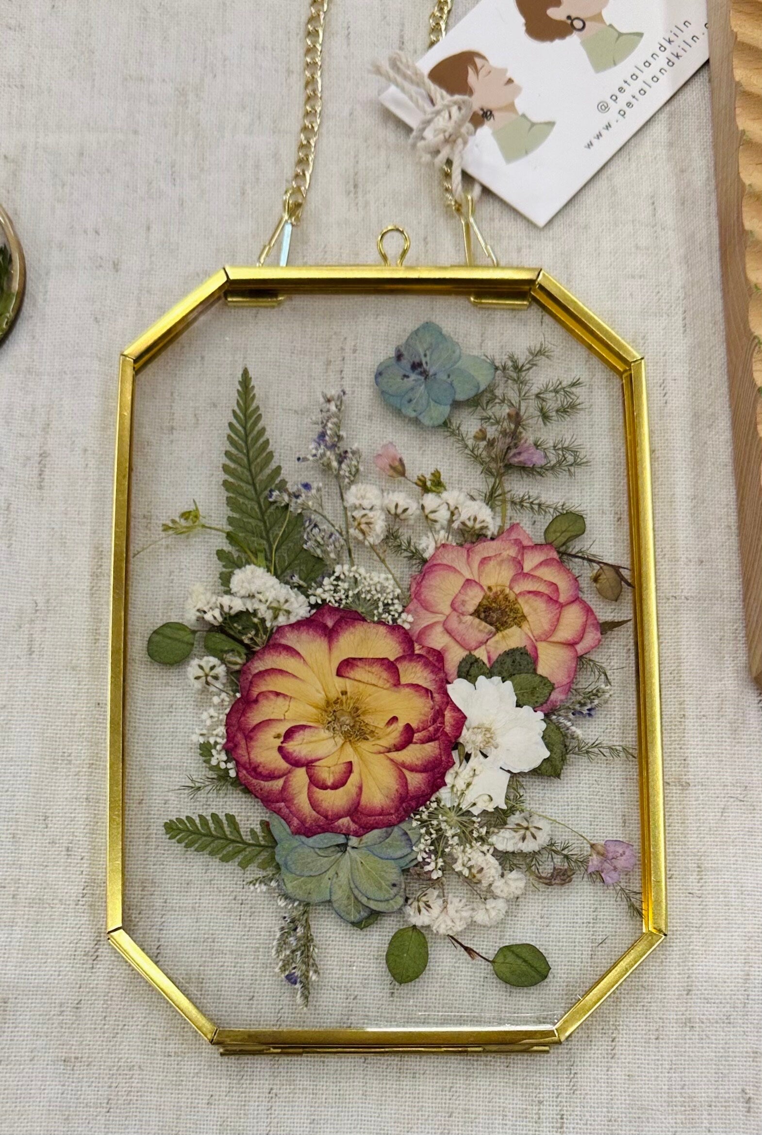 Real dried pressed flower collage in glass and gold metal frame. Flowers have been sprayed with UV protectant to slow any fading from sun exposure, but keeping this out of direct sunlight will preserve the flower colors even longer.